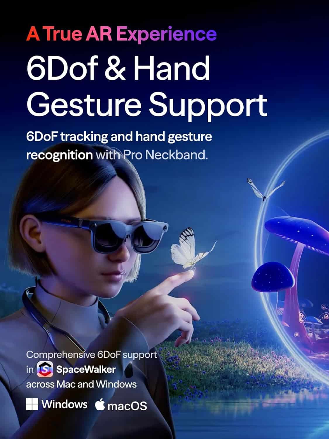 Priekinė RGB kamera ir dvi gylio kameros leidžia tikslų 6DoF sekimą, rankų gestų atpažinimą ir erdvinį skaičiavimą. Tai ženkliai pagerina judesių tikslumą ir erdvinį suvokimą tiek darbui, tiek XR sąveikai. Pilnas 6DoF palaikymas galimas naudojant SpaceWalker macOS ir Windows sistemose (reikalingas VITURE Pro kaklo modulis).
